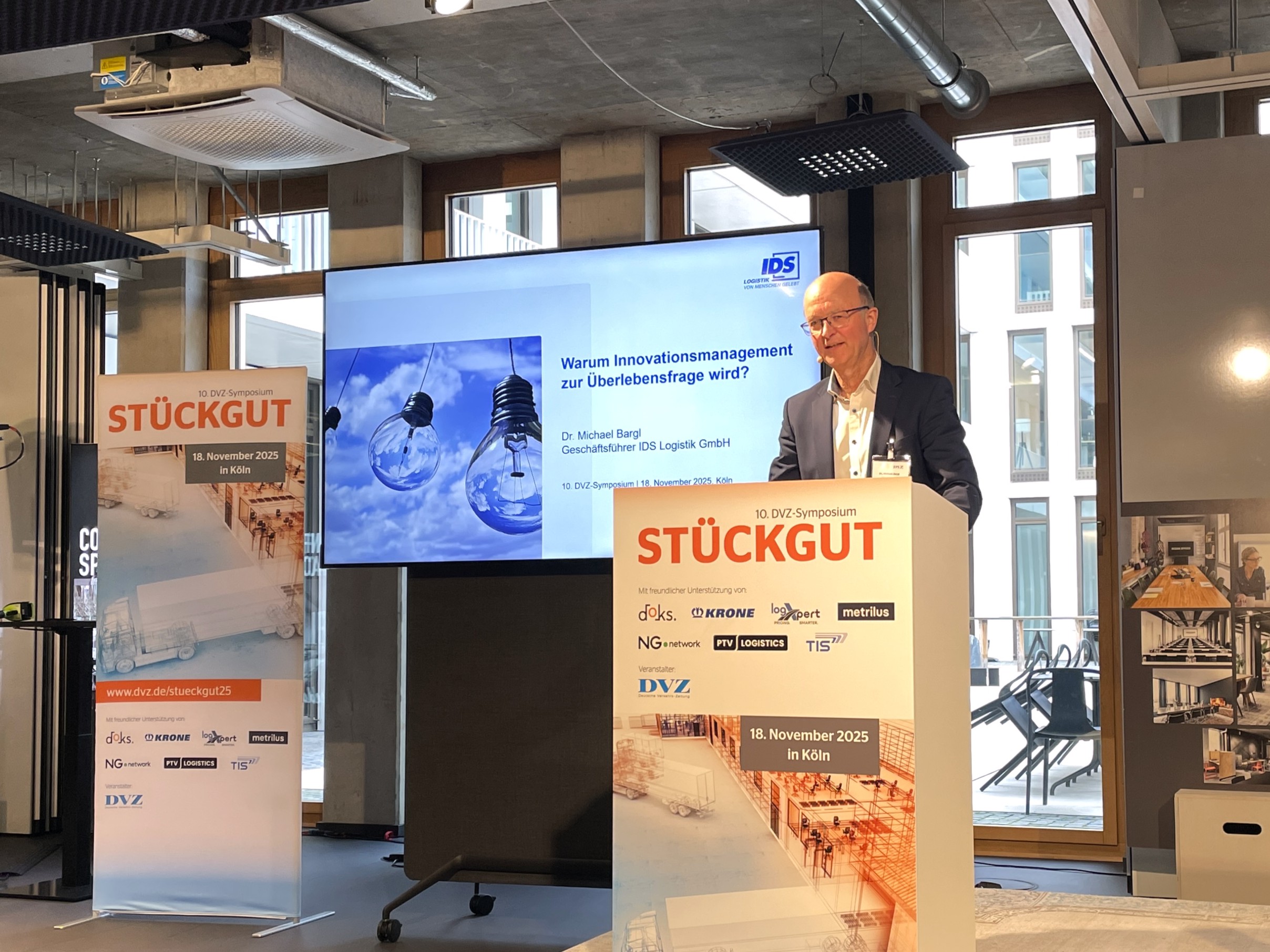 Auf dem Wandmonitor im Umschlagzentrum erscheinen die Sendungsnummern nahezu verzögerungsfrei. „Wir konnten 99,5 Prozent der Sendungen automatisch erkennen“, sagt Dr. Michael Bargl, Geschäftsführer der IDS Logistik GmbH. „Das bedeutet weniger Fehler, weniger Zeitverlust und bis zu fünfzig Prozent weniger Personalaufwand beim Eingangsscan.“ Dieser Test ist Teil eines größeren Plans. Denn IDS sieht Innovationsmanagement heute als Überlebensfrage. Wie das Innovationsmanagement von IDS aussieht, stellte Michael Bargl am 18. November 2025 beim 10. DVZ-Symposium Stückgut in Köln vor.